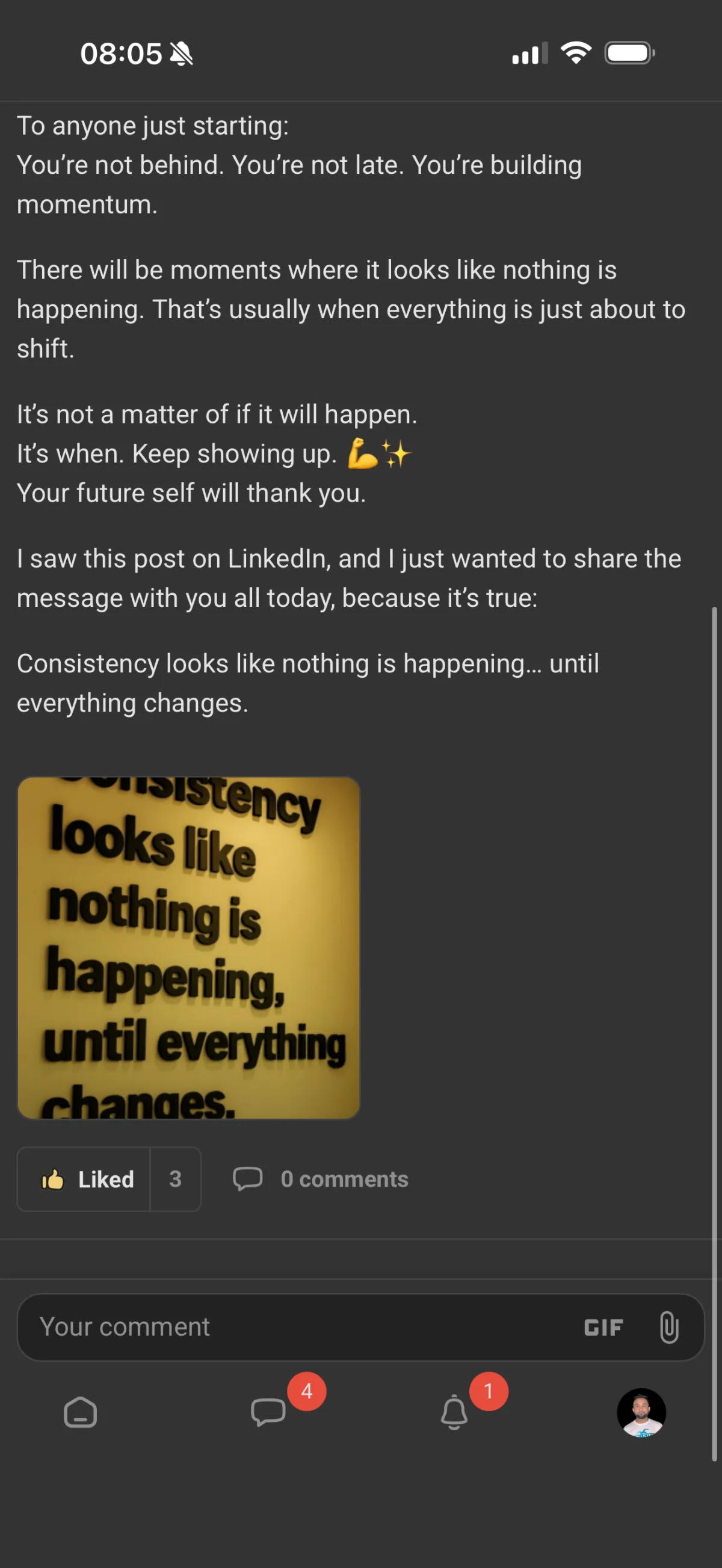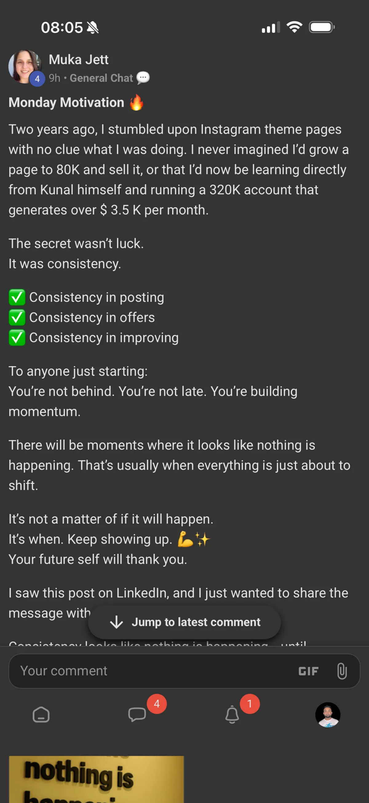 There are people inside who are just starting out like you, and there are others who are at 1000 followers, 50,000 followers, 100k followers, 500k followers, 1 million followers, there are people in various different stages who you can learn from.