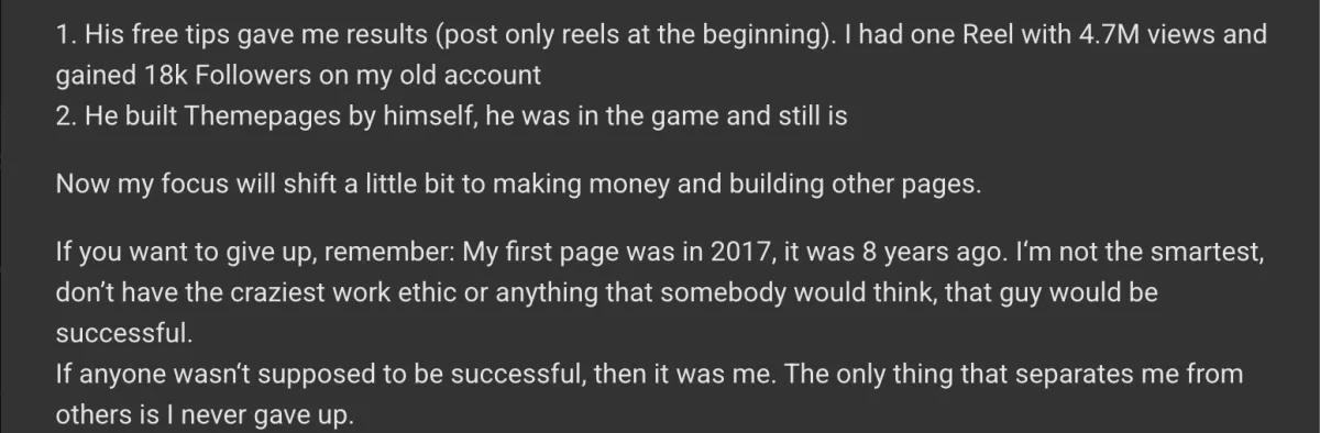 The IG Theme Page Mastery course is amazing. Everything is explained in-detail. This course WILL get your results IF you are an action taker. I am personally seeing multiple students getting results in the community (private discord server)