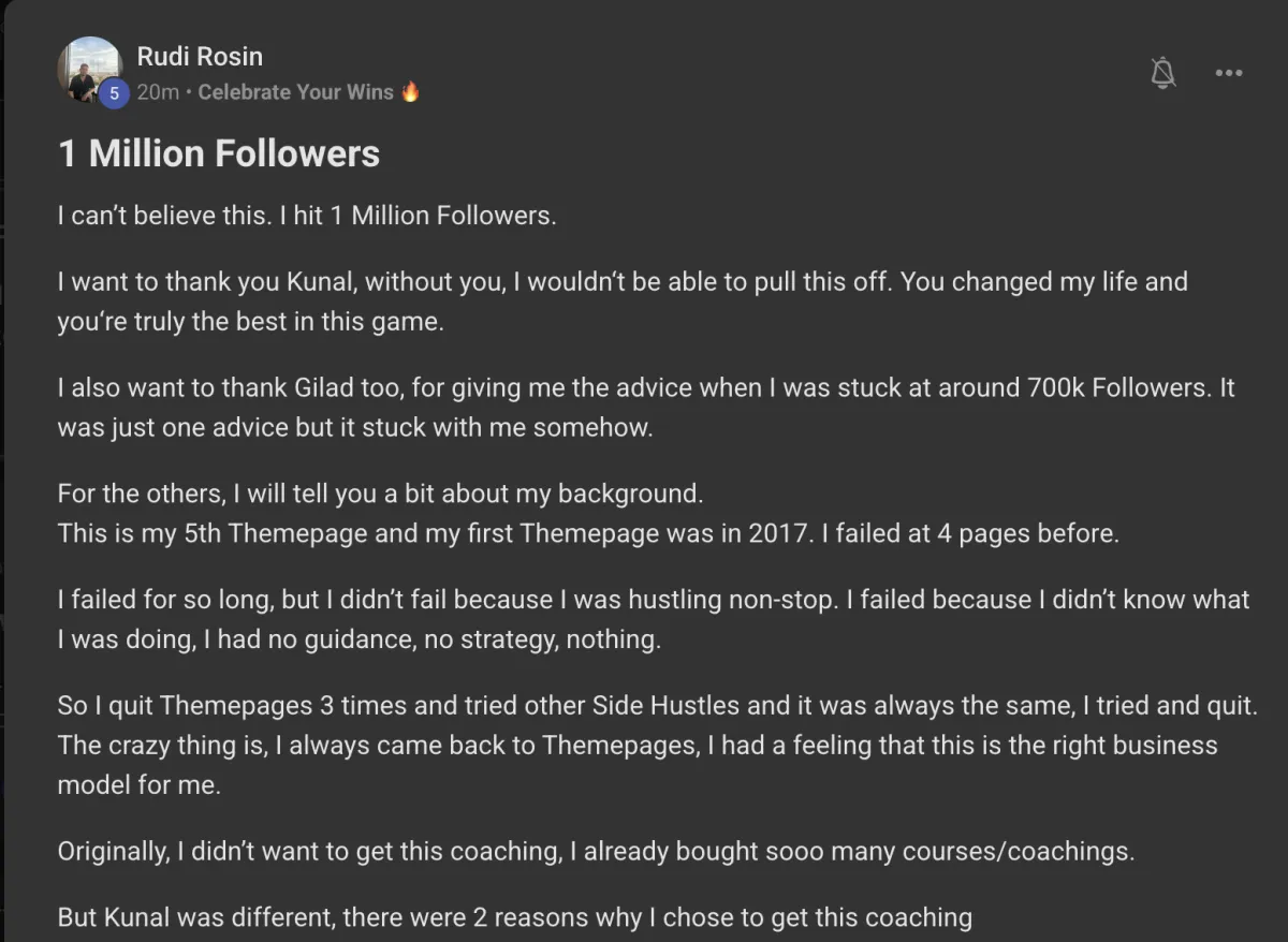 I’ve watched courses/videos about IG theme page growth and all of them are the same, “giving value but not letting you know the real strategy to make Theme pages work”. But with IG theme page mastery, I see clarity and like its simplicity. The course isn’t too long (a strategy some coaches use to make you feel like they give value) but this course shows that good and valuable doesn’t have to be long; it can be short, concise, straight to the point, and yield results. It’s a proven strategy and I keep on telling myself that I must have done something really good in my life to be led to find this course, lol! Thank you Kunal for sharing your knowledge and genuinely helping us to make it without holding back the right information!
